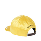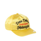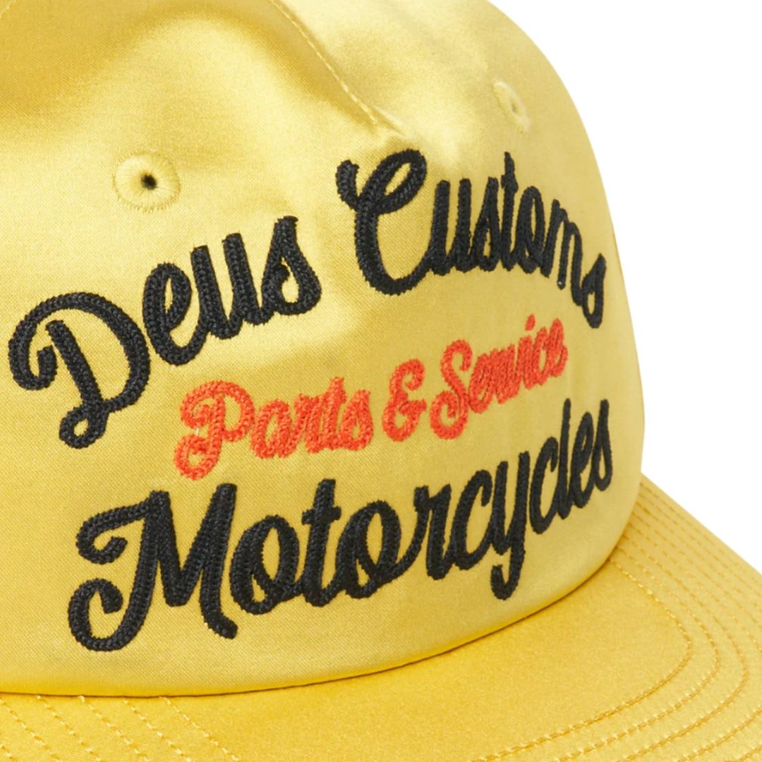 Deep Fit Pinch Front Hat With Chainstitch Embroidery On Front Panel And Visor And Leather Strap Closure In Satin Fabrication .