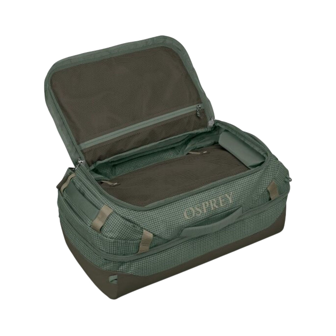 Dual entry duffel featuring both 50/50 clamshell access and traditional top-loading style with rollaway dividers