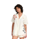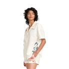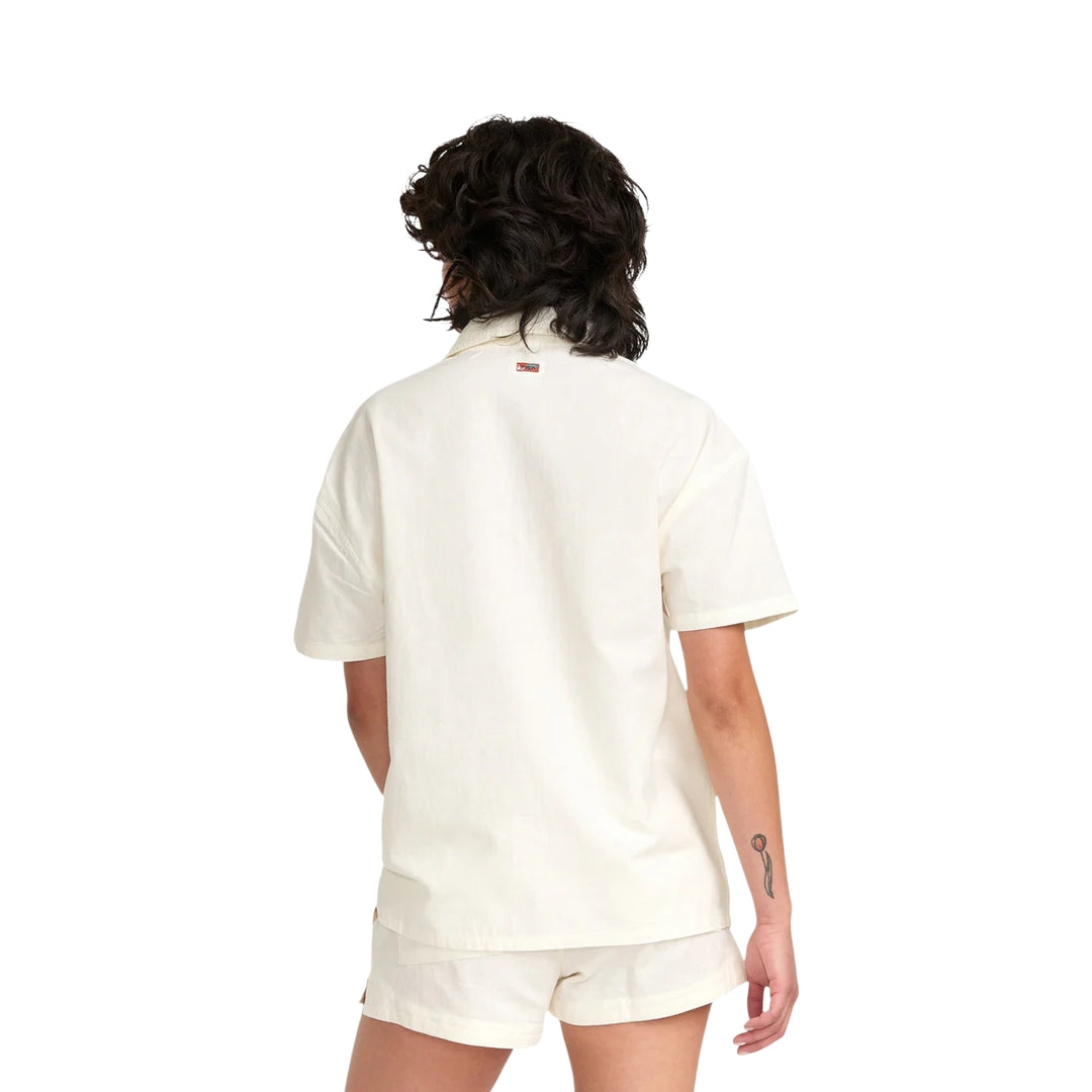 RVCA's Lauryn Button Up Polo that is part of Lauryn Alvarez collection. It features 15% linen and 85% cotton blend with a relaxed fit, and a collar with CF button closure all over yardage printed stripe.