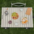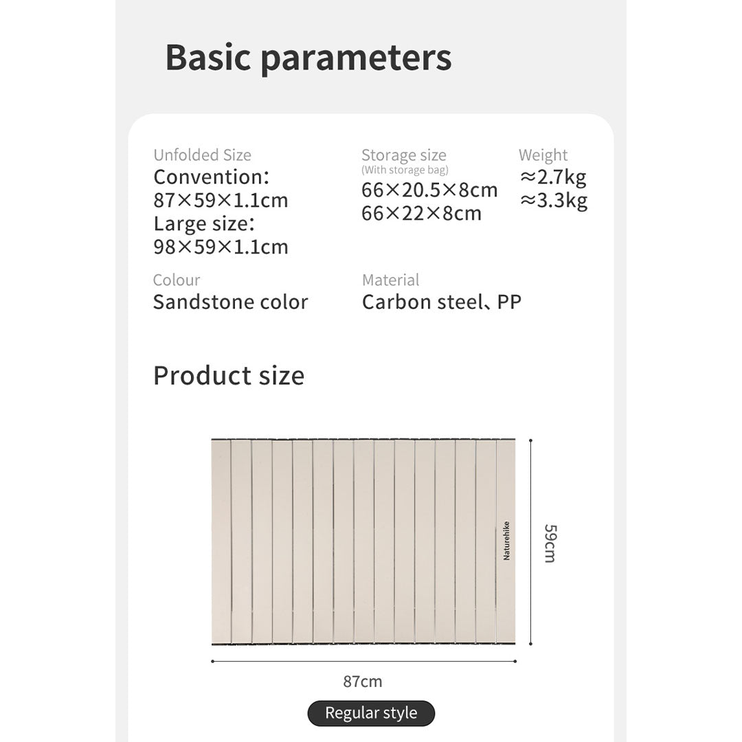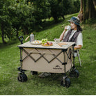 The Universal Trolley Table Board designed to convert outdoor folding wagons into a functional tabletop. It is built with a durable carbon steel frame and a roll-up "egg roll" style top, making it a portable solution for outdoor dining and gear organization.