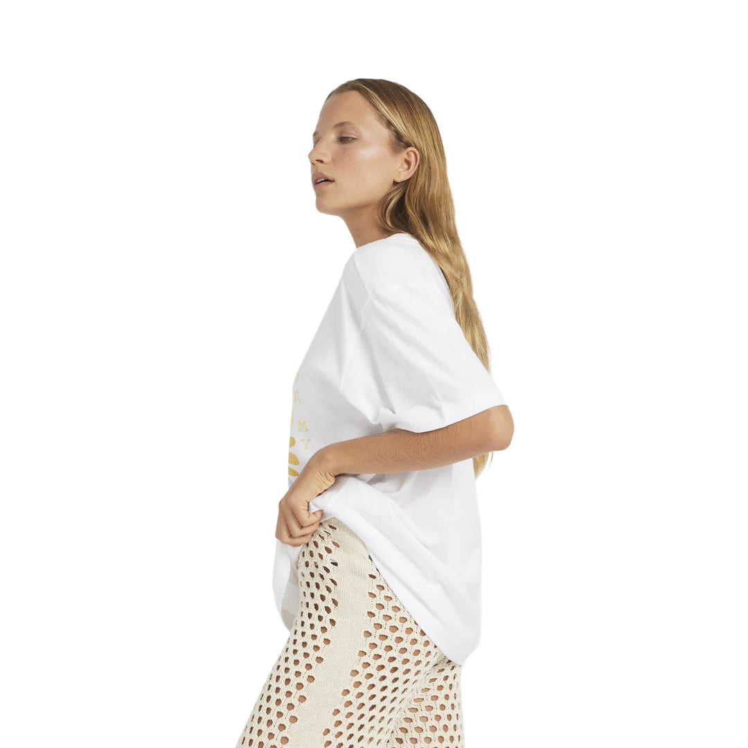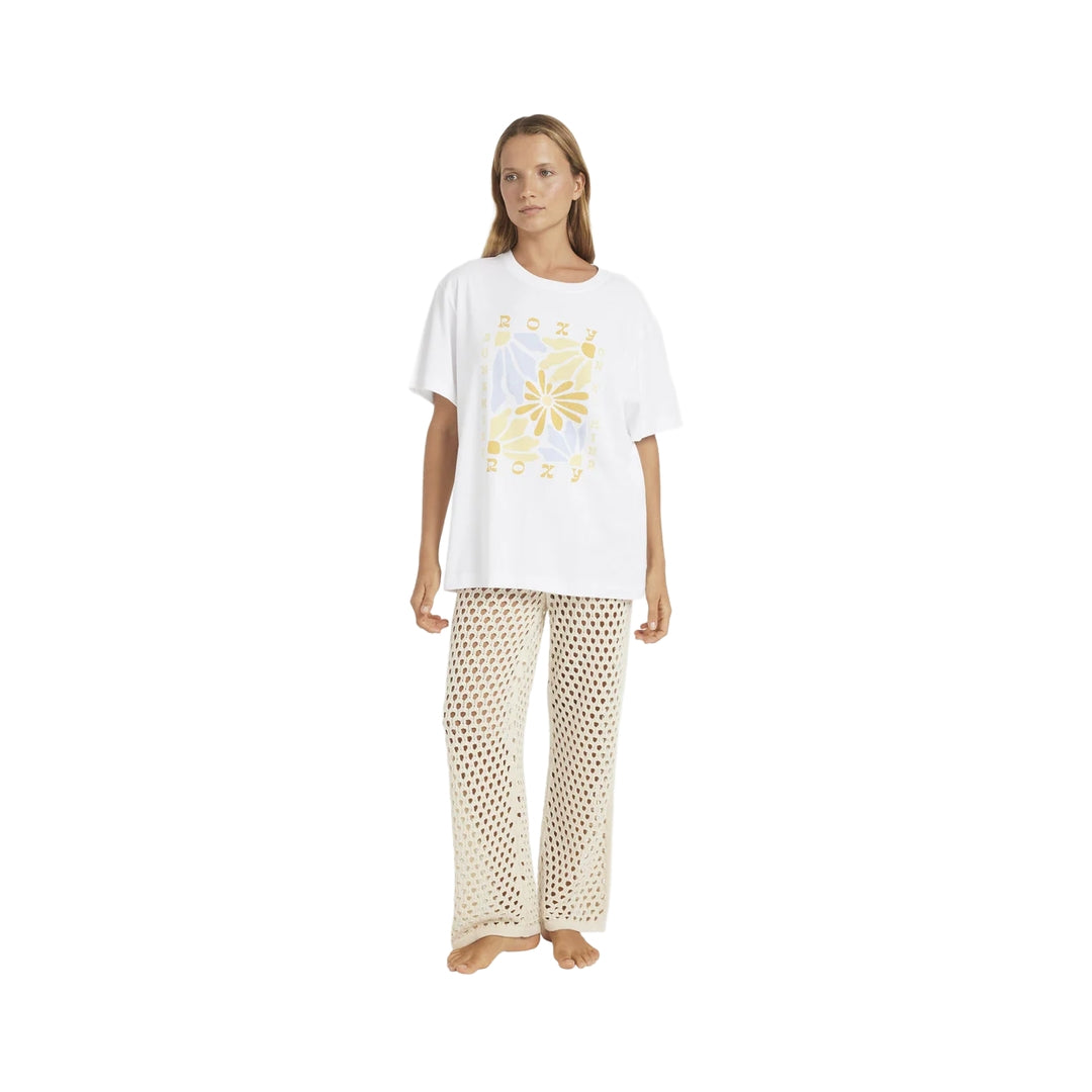 - Type: Short sleeve tee Fabric: 100% Cotton 165g/m2 Fit: Loose Wash: Garment wash Rib at neckline with taping to inside back shoulder to shoulder Roxy graphic at chest Screen printed label on center back neck