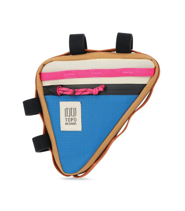Pack more for your ride. Stash your phone, spare tools, snacks, or Topo Neck Gaiter, and you're ready to roll. The Bike Frame Bag attaches securely to the top tube and seat tube, allowing for an easy-access, perfect fit. -Daisy chain webbing on each side -Triangular main compartment -Waterproof truck tarp liner -VELCRO® attachments through various webbing points
