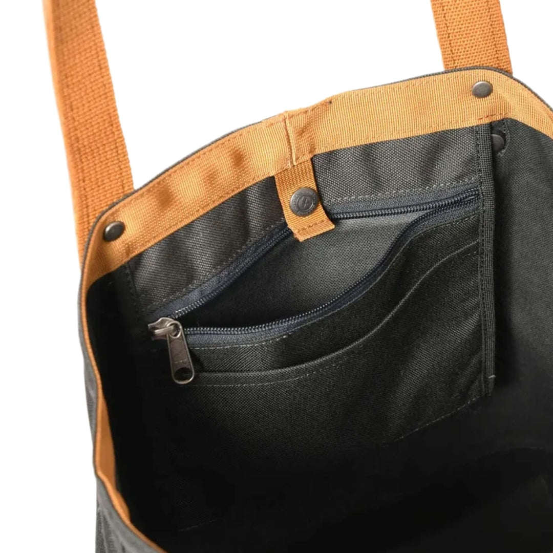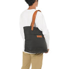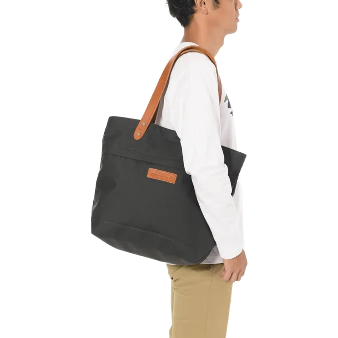 This durable tote bag is made of exceptionally rugged material. Can fit B4 sized documents. The bag closes with a snap to keep contents in place. The straps are made of thick, high-quality leather. Suited to a wide variety of uses and environments. *This product's straps are made using natural leather, which can have wrinkles or irregular coloring. It is also possible for the leather's color to fade or transfer to other materials.